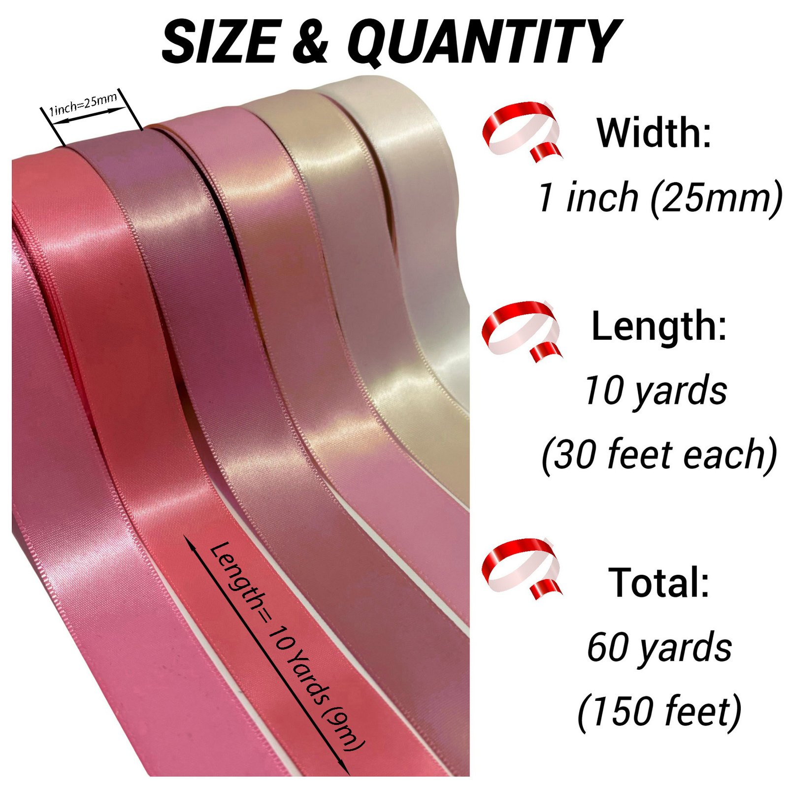 ✅ SIZE: Each roll is 1″ wide x 10 yards long, total 60 yards. A sufficient quantity of satin ribbon will meet your daily needs for decoration and crafts